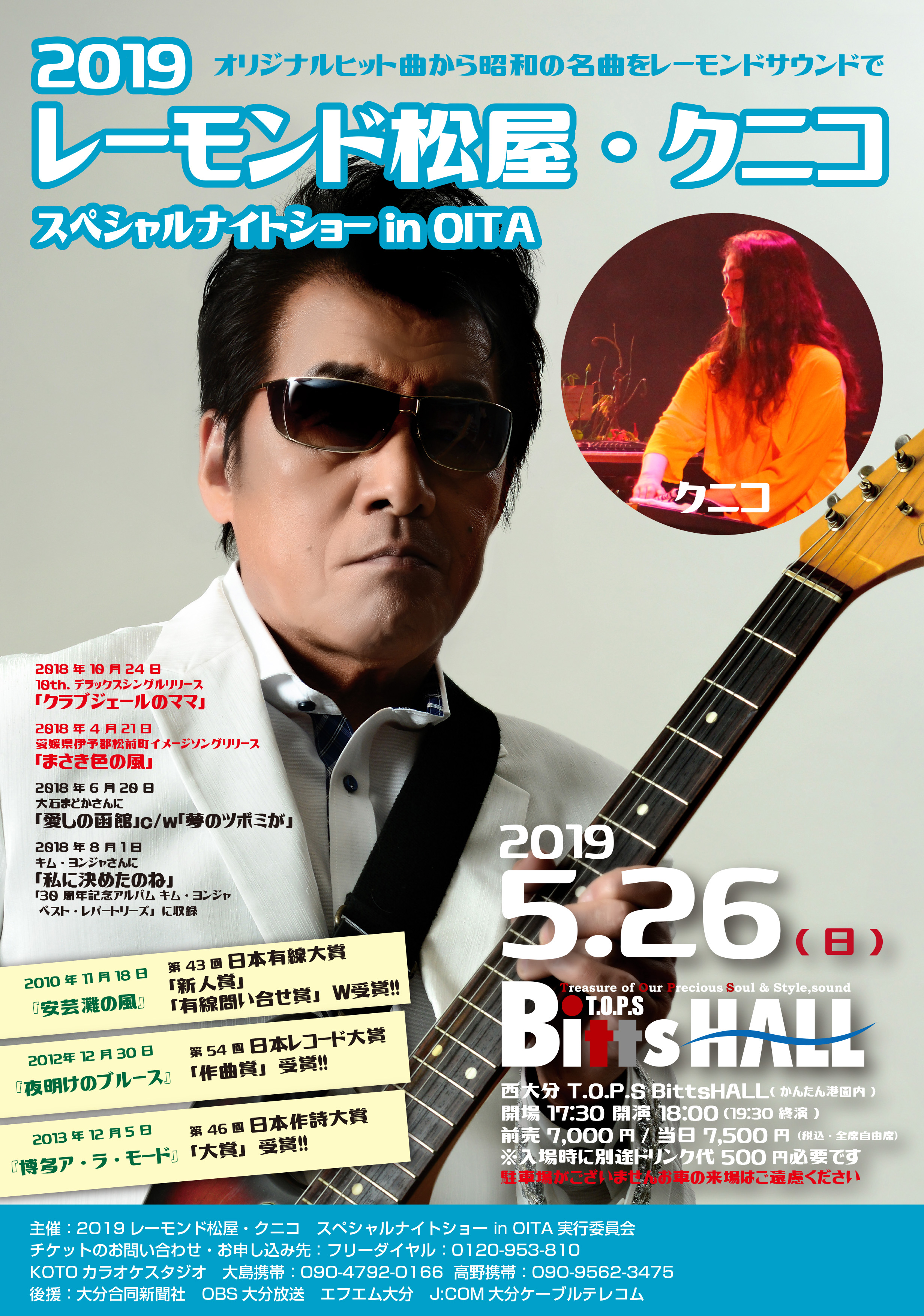 主催・お問い合わせ:イベントオフィスヤング株式会社 レーモンド松屋ファンクラブ事務局 〒799-1354 愛媛県西条市北条626-3 TEL・FAX:0898-64-6722オリジナルヒット曲から昭和の名曲をレーモンドサウンドで 2019 レーモンド松屋・クニコ スペシャルナイトショー in OITA